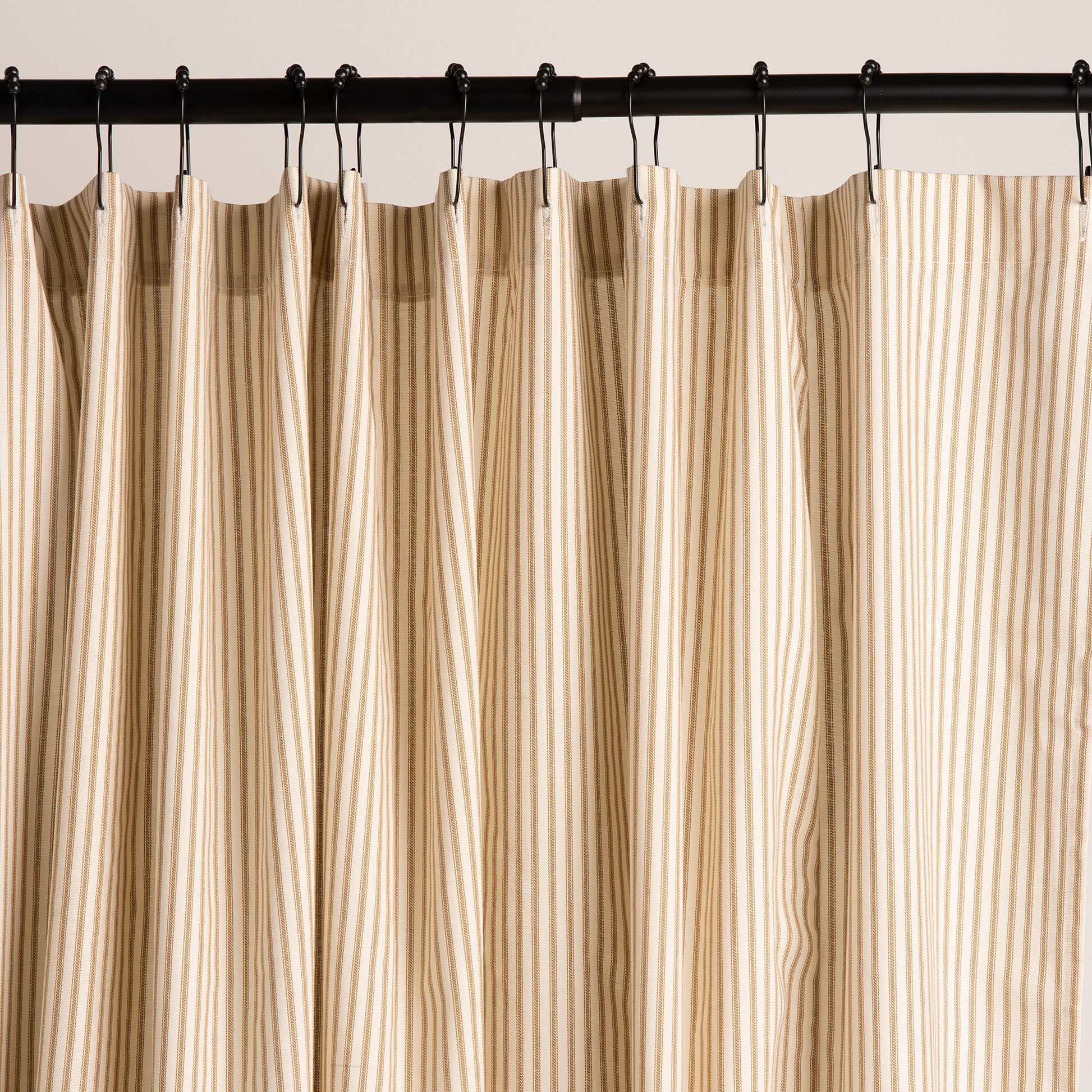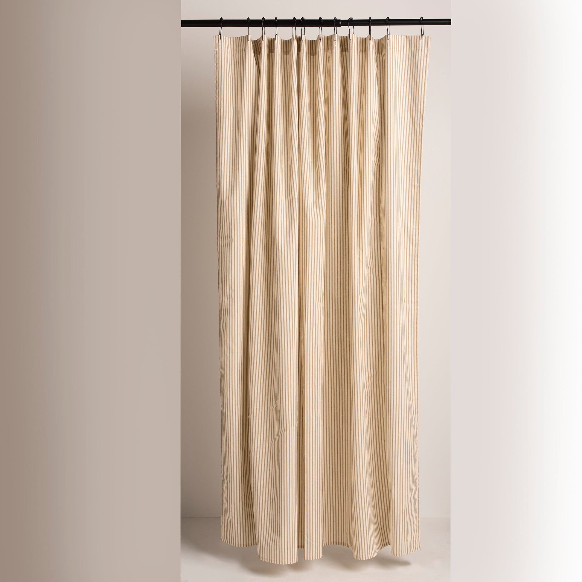 Our Shower Curtains are100% Cotton Made in USA 72"x72" standard, 72x84 extra tall or 72x96 extra tall and extra wide sizes available. Features brown stripe fabric shower curtain in classic ticking stripe fabric. Buttonhole Top Standard. Brown and cream designer quality printed ticking stripe fabric. All our fabric shower curtains are proudly made in the USA of imported 100% cotton ticking fabric printed and finished in the USA. As always fabric samples are available in our shop. All other sizes made to order. If item is not listed as in stock, please allow a 1-2 week lead time, all items ship via USPS or UPS ground with tracking in the USA. All measurements stated in width x height.