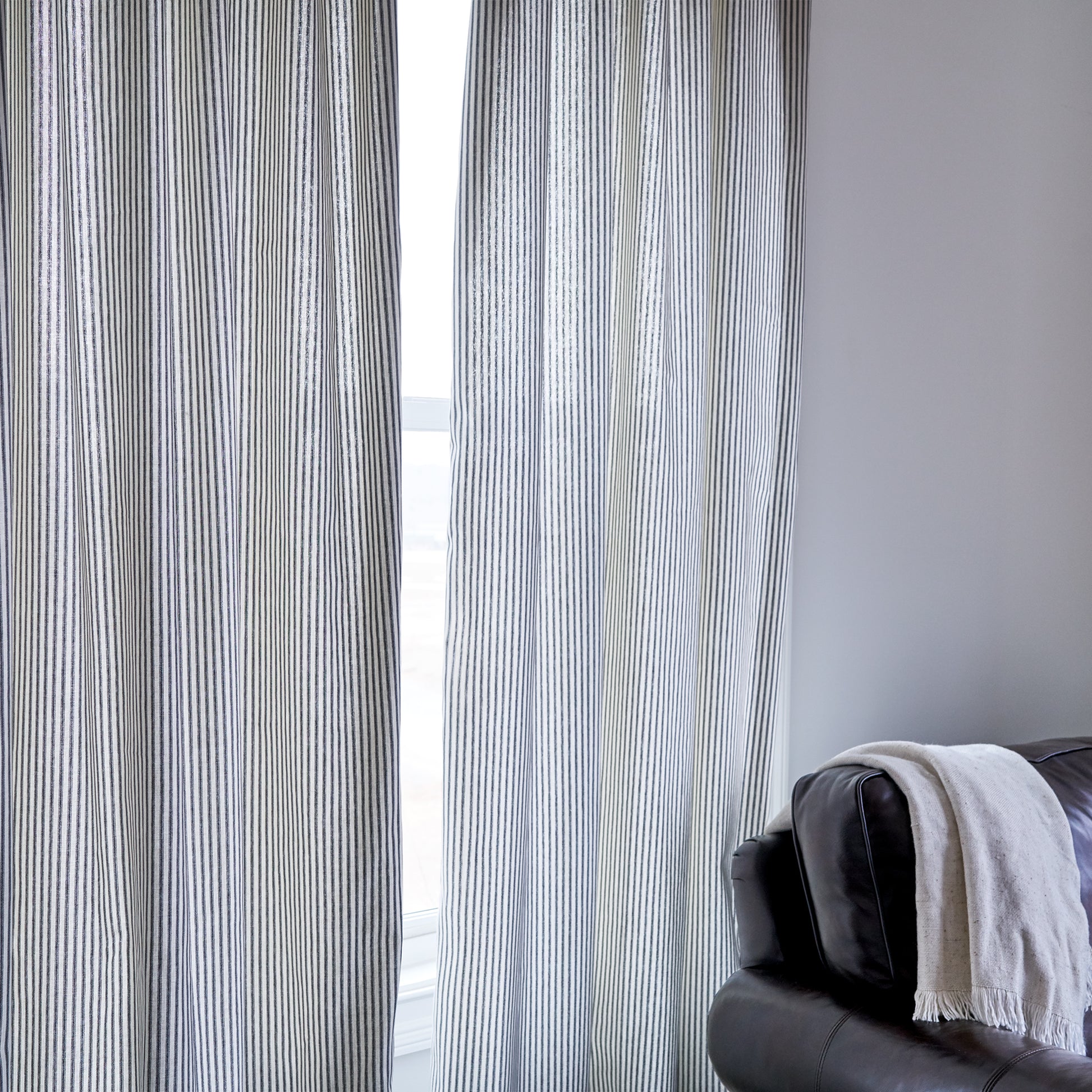 Our classic black ticking stripe curtain panels are available in black and cream and black and white (last photo) lined and unlined for an instant update for any room. Available in 50" Wide with standard lengths: 84", 96", 108" or 120" tall curtain panels. Need Double Width? Just contact us for a quote. Our curtains feature a generous 3" rod pocket at the top of the panel or use clip rings as shown to hang these curtain panels (not included). The perfect finishing touch for any curtain or drape project. Made to order in the USA by Southern Ticking Co. if 100% cotton ticking stripe fabric. Panels are sold separately. Lining available for an upcharge upon request. This is a made to order item, please allow a 1-3 week average lead time. Item ships via UPS ground with tracking in the USA. Please note due to their custom nature all curtain panels are considered a final sale. Samples are available upon request.